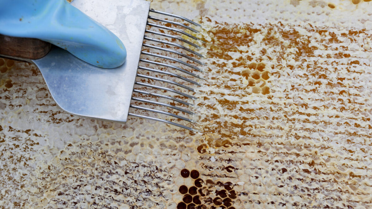 Vi skrabede en enkelt tavle med mad, og satte den frem til bierne. Dog bagved den tavle vi satte i forrige uge, for der var stadig en del mad tilbage på tavlen. Men det er vigtigt at bierne ikke sulter lige nu, for ungerne skal have mad, lige så snart dronningen mener det er varmt nok til at lægge en masse æg.
